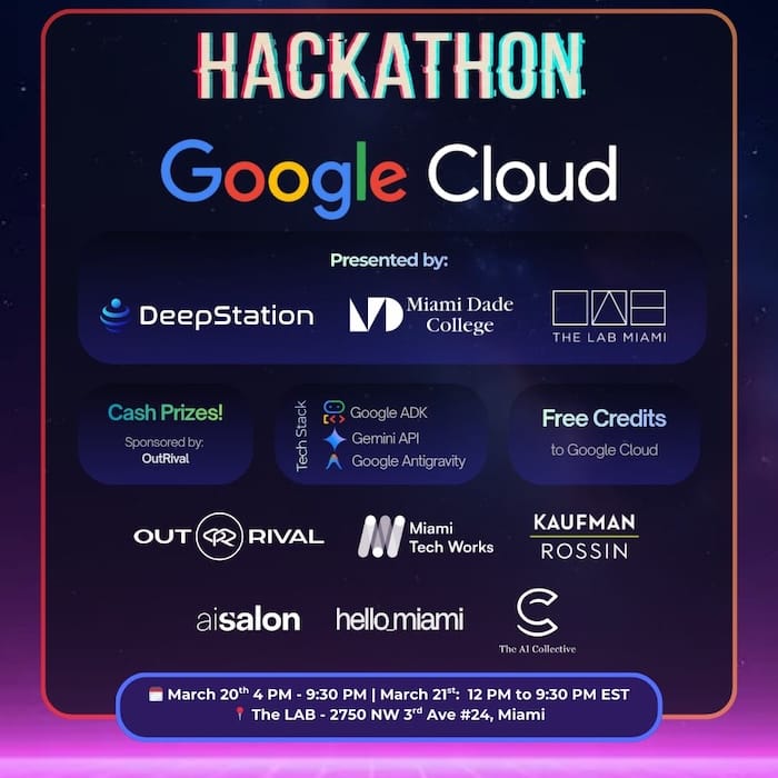 Google AI Hackathon in Miami: Two days of innovation as developers, founders, and AI builders gather at The Lab Miami to compete for cash prizes using Google's latest AI tools.
